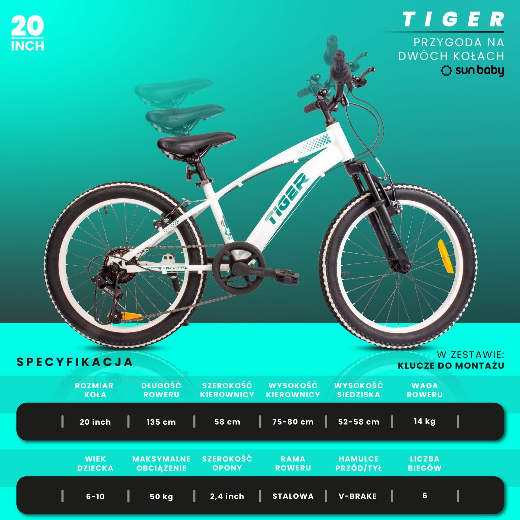 - Rowerek 20” – wzrost 115–135 cm, wiek 6–10 lat