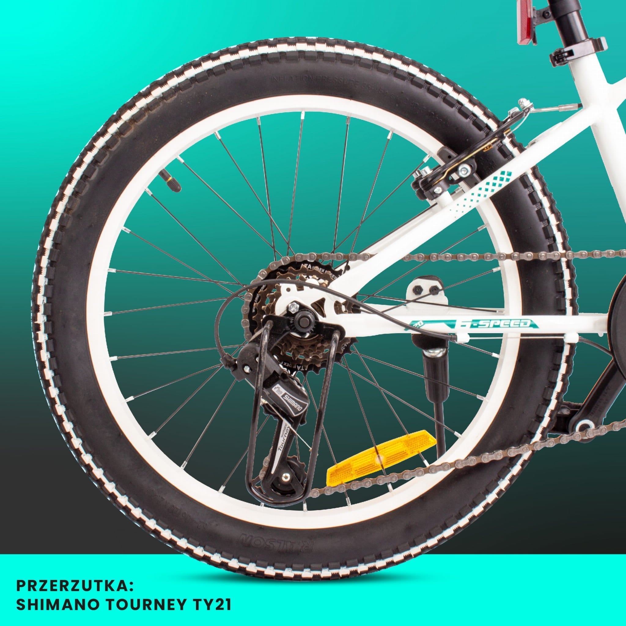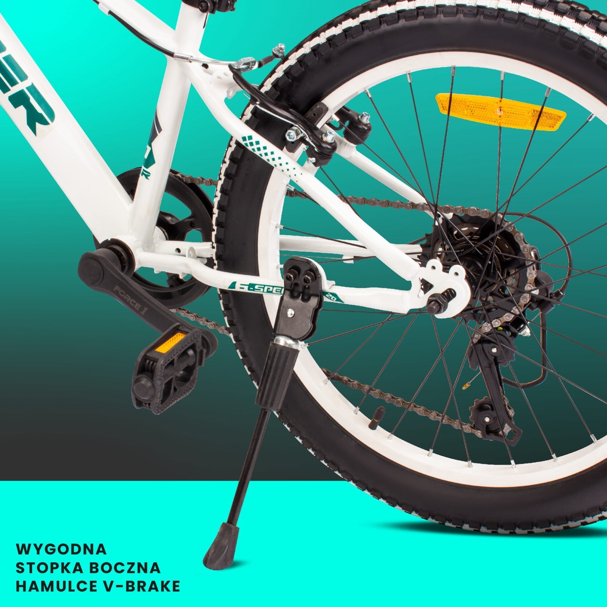 - Opony terenowe 2,4” typu BMX na aluminiowych obręczach