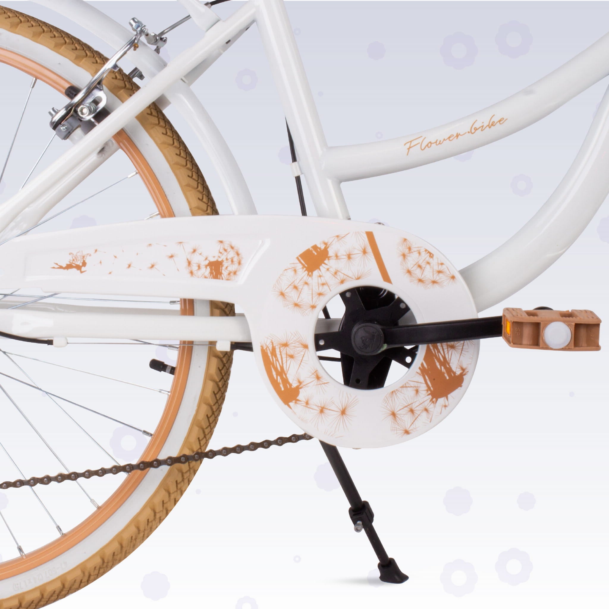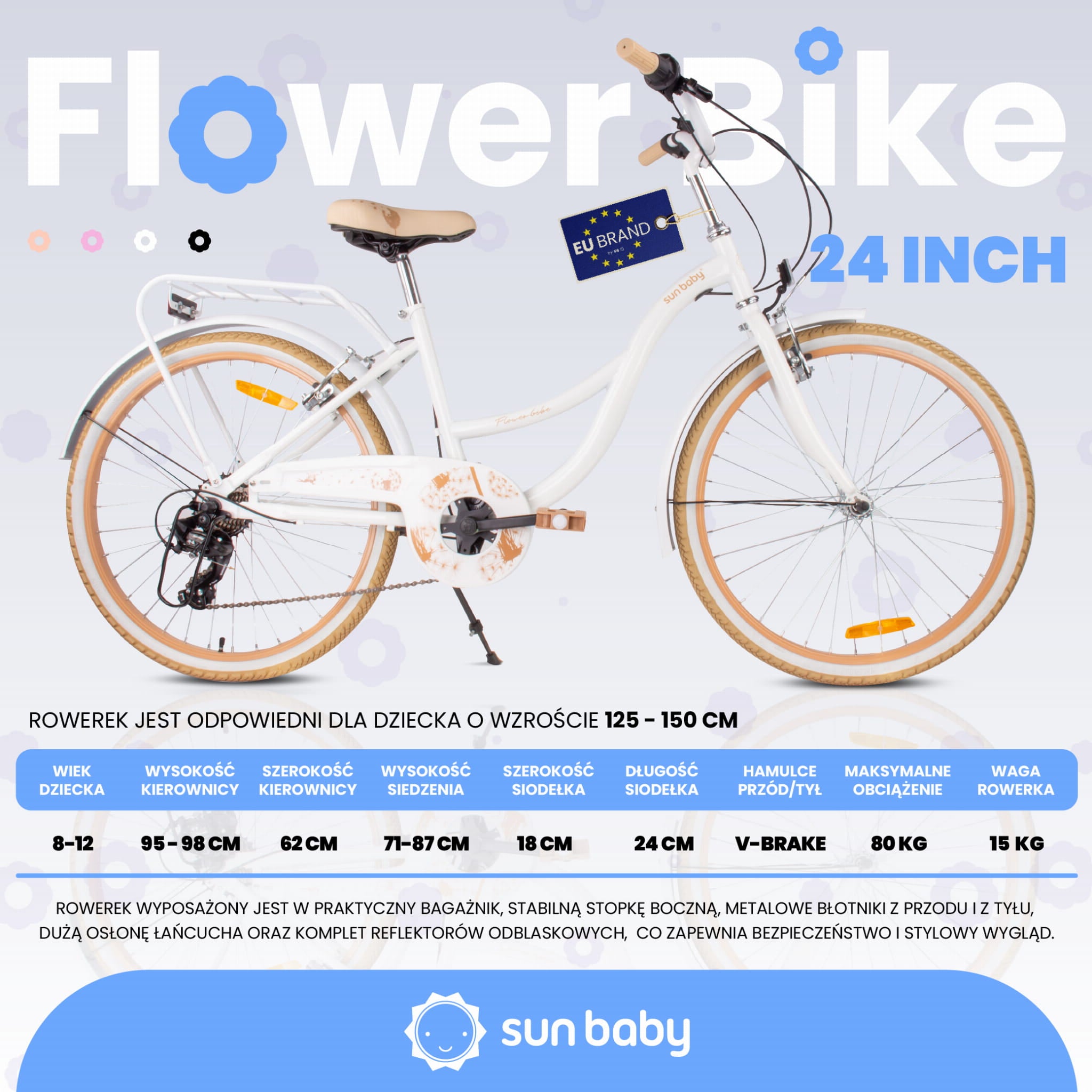 ✔️ rowerek zawiera: hamulce V-brake przedniego i tylnego koła, metalowe błotniki przód i tył, duża osłona łańcucha, odblaski, dzwonek, bagażnik, stopkę boczną, przerzutkę Shimano