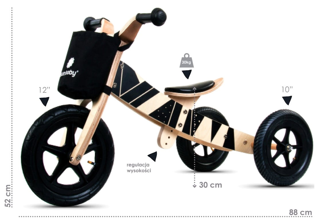 Jedyny w swoim rodzaju rowerek biegowy dla dziecka. Na początek rowerowej przygody maluszek jeździ na trzech kółkach, które zapewniają stabilność, co chroni przed wywrotką. Po opanowaniu jazdy na trzech kołach, przekształcamy pojazd w rowerek biegowy i...w drogę!