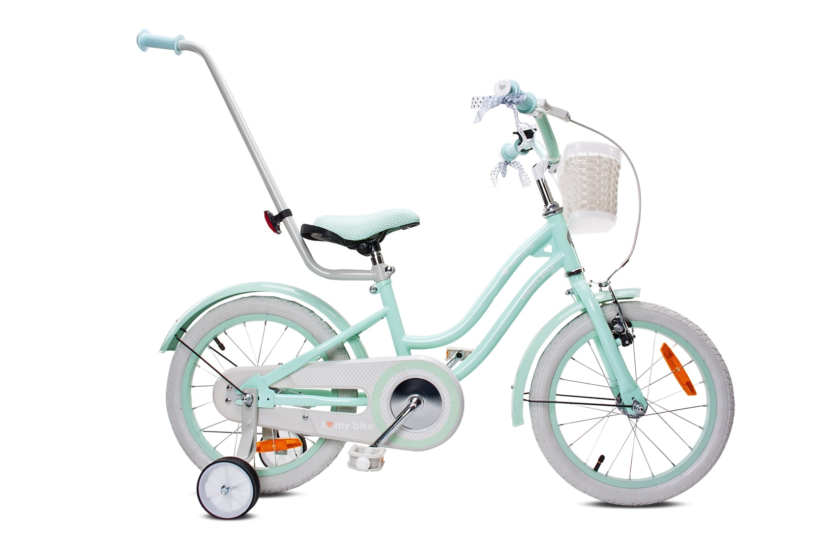 Sun Baby Rower dla dziewczynki 16 cali Silver Moon miętowy – pchacz, koszyk, kółka boczne