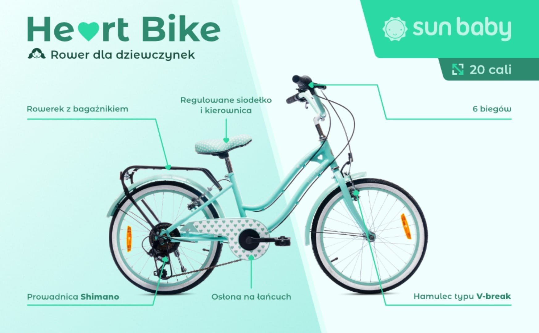 Sun Baby Rower dla dziewczynki 20 cali Heart Bike miętowy – 6 biegów Shimano Tourney Revoshift
