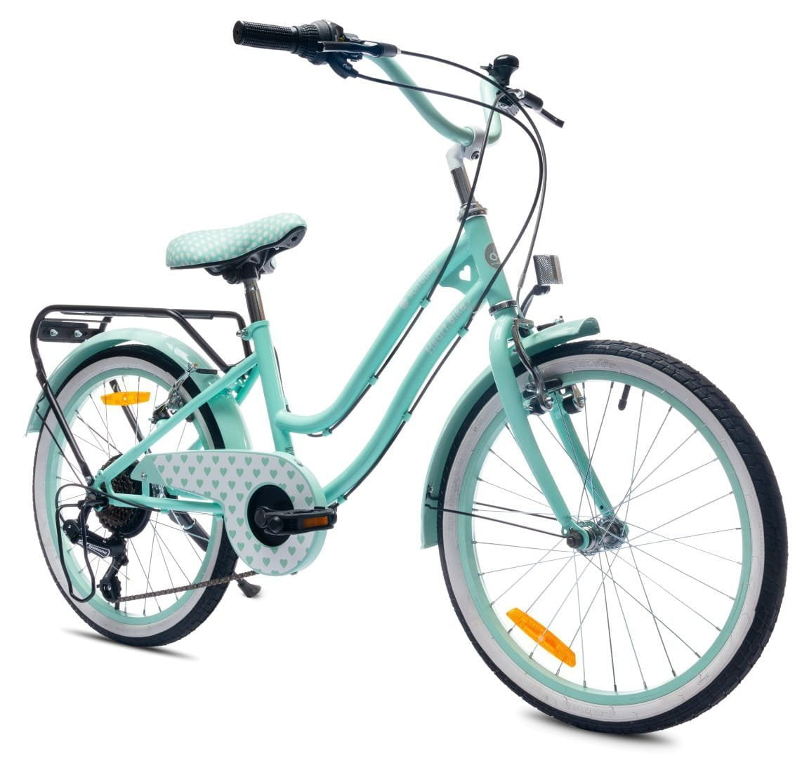 Stylowy rower dziecięcy Heart Bike 20 cali w kolorze miętowym to idealny wybór dla dziewczynki w wieku 6–10 lat. Wyposażony w 6-biegową kasetę Shimano Tourney i manetkę Revoshift, gwarantuje wygodę oraz bezpieczeństwo zarówno podczas jazdy miejskiej, jak i dłuższych przejażdżek.