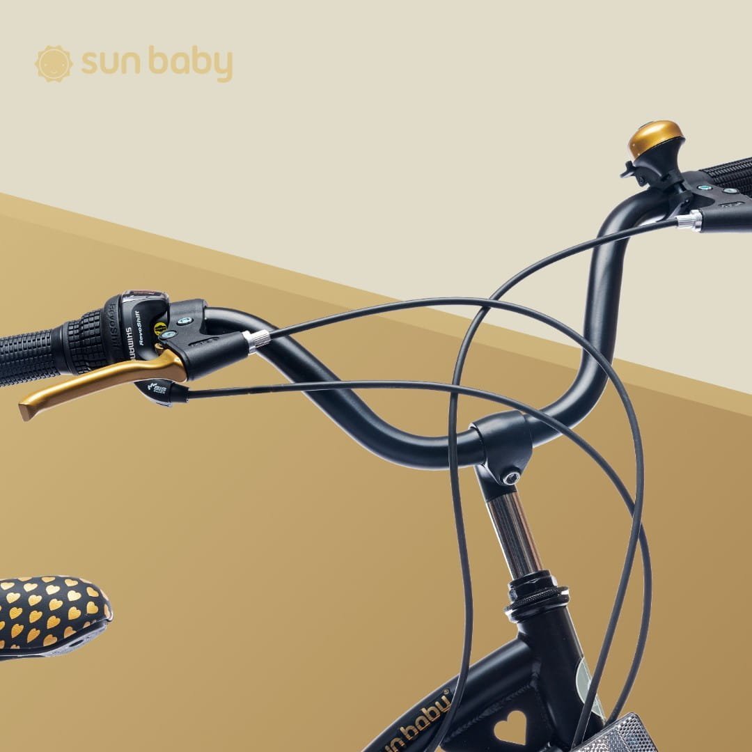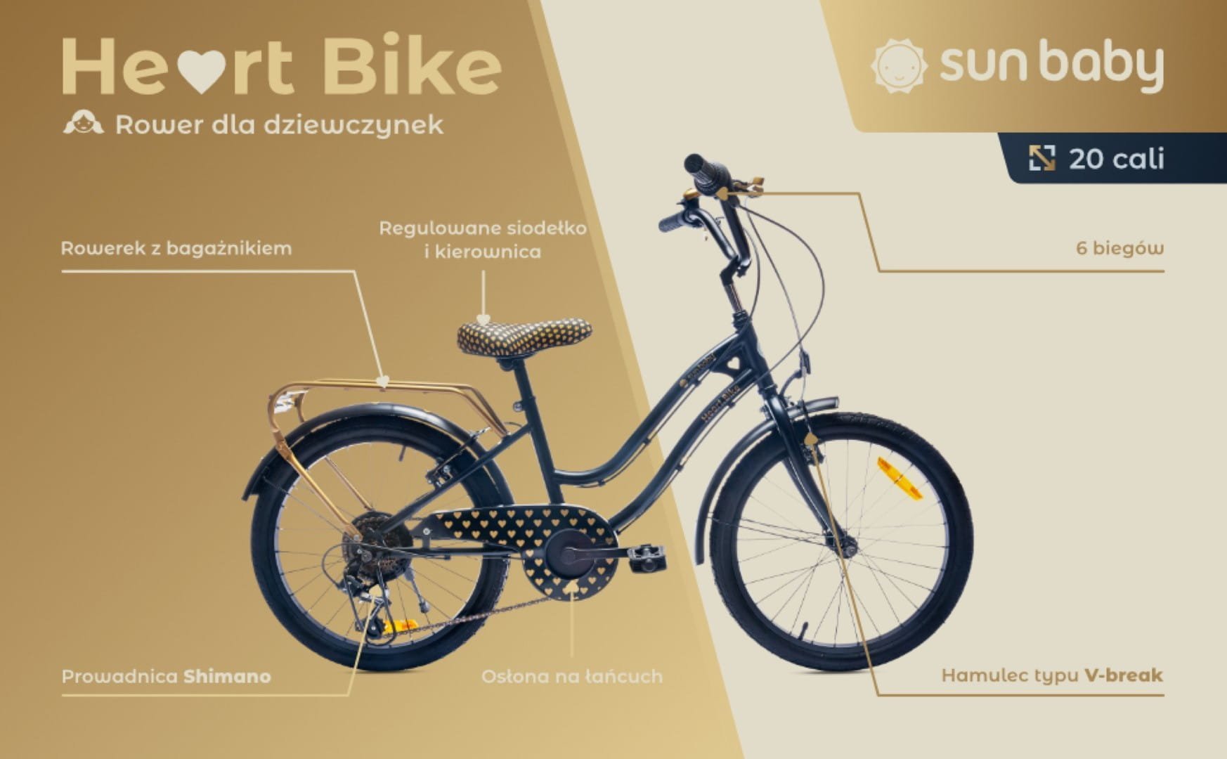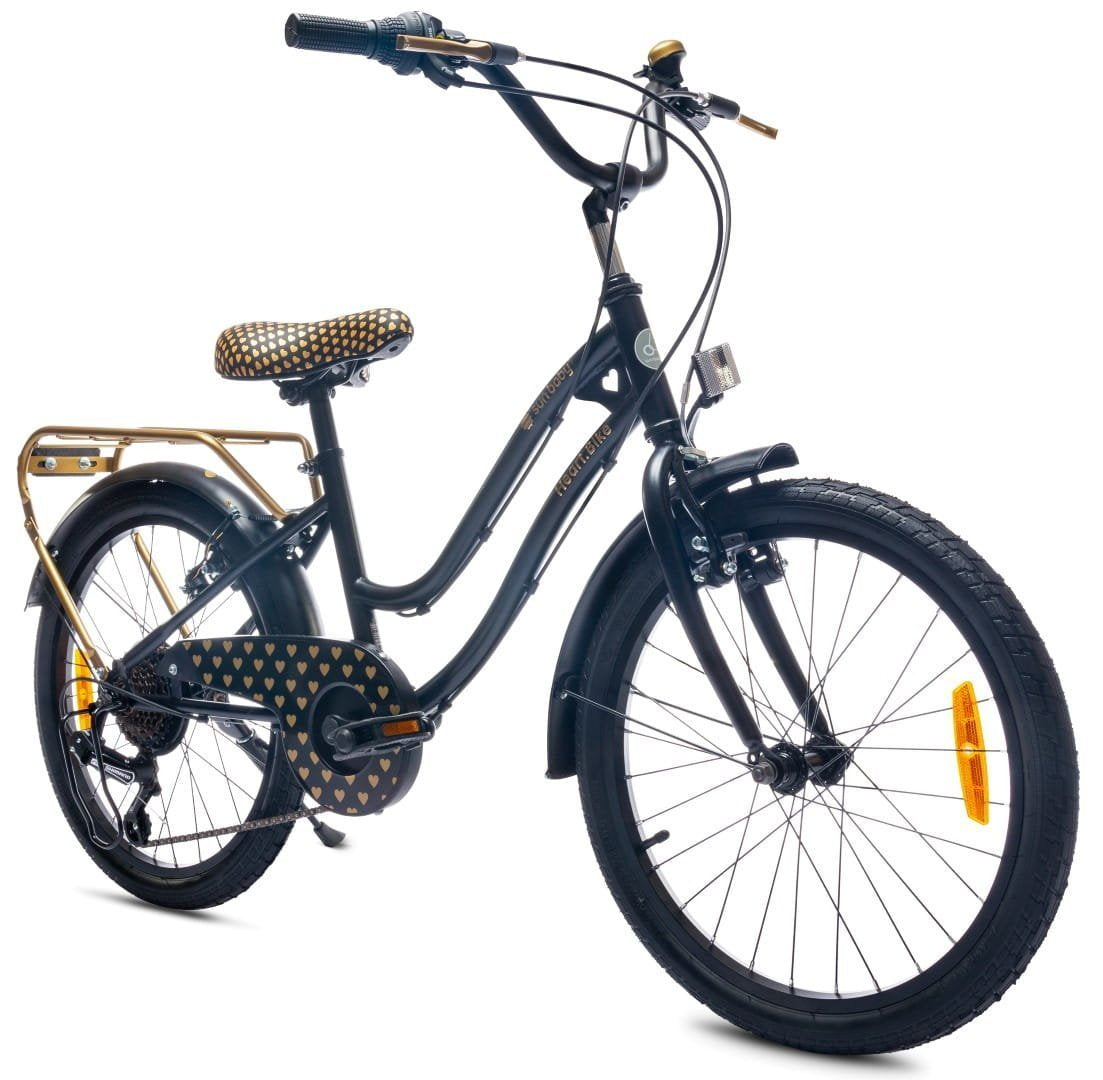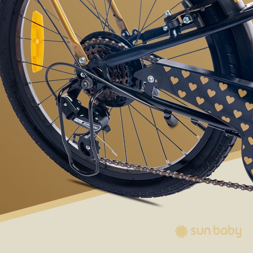 Rower dla dziewczynki 20 cali z 6-biegową kasetą Shimano Tourney i manetką Revoshift Heart Bike czarno zloty