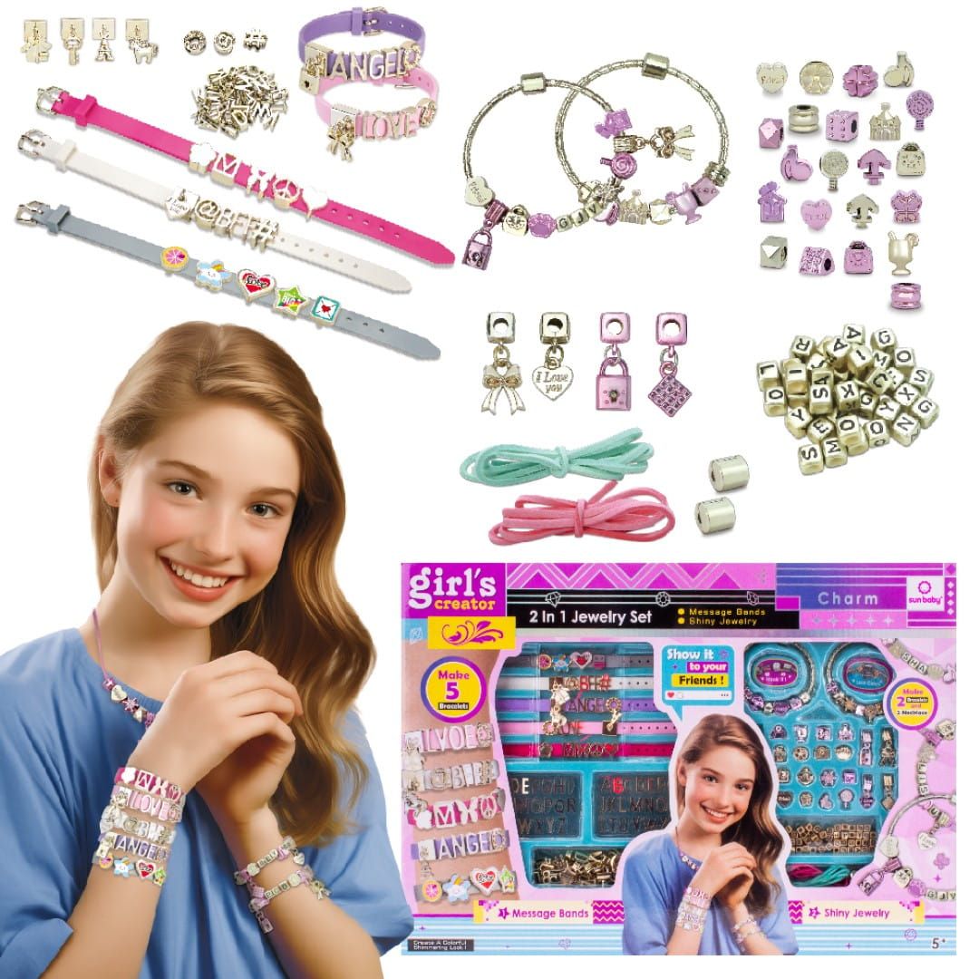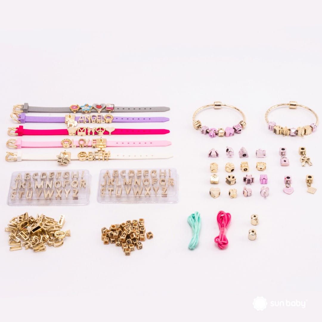 Zestaw zawiera pięć bazowych opasek, które można ozdobić nakładkami z literkami i tematycznymi zawieszkami, tworząc osobiste akcesoria. Dodatkowo, w komplecie znajdują się dwie bazowe bransoletki, które można wzbogacić koralikami z literkami oraz urokliwymi charmsami w odcieniach złota i różu. Wytrzymałe, satynowe sznurki w pięknych kolorach dopełniają zestaw, umożliwiając stworzenie wyjątkowych biżuteryjnych projektów.