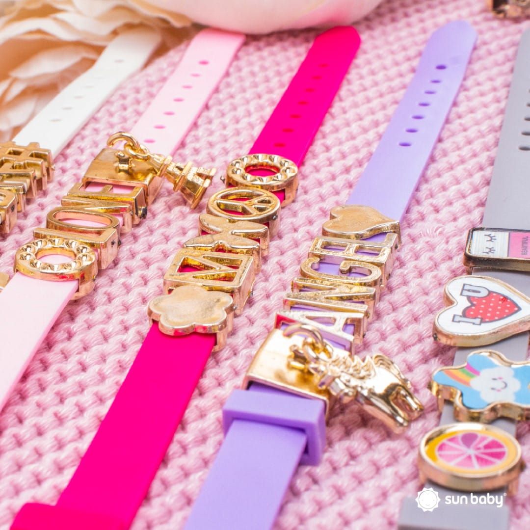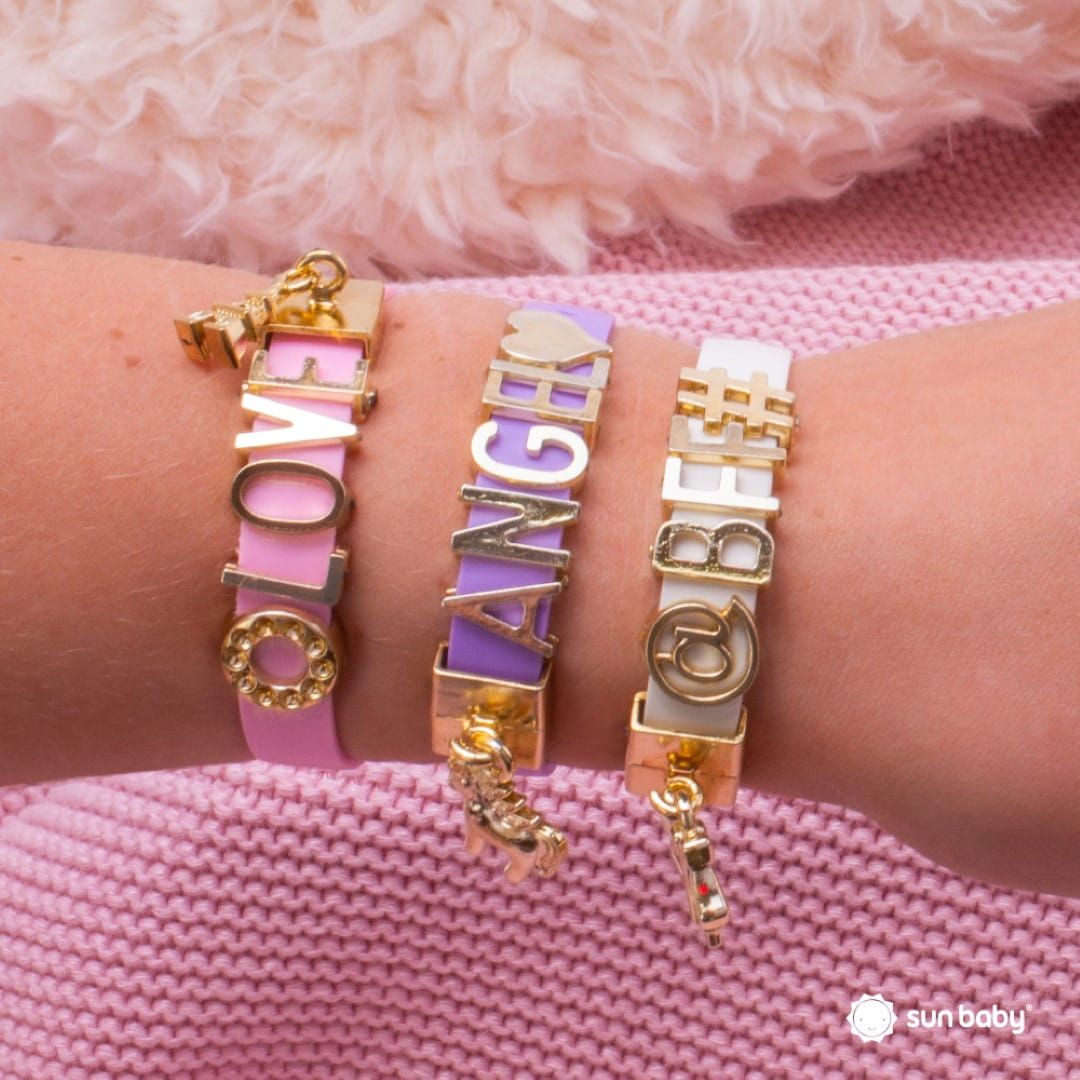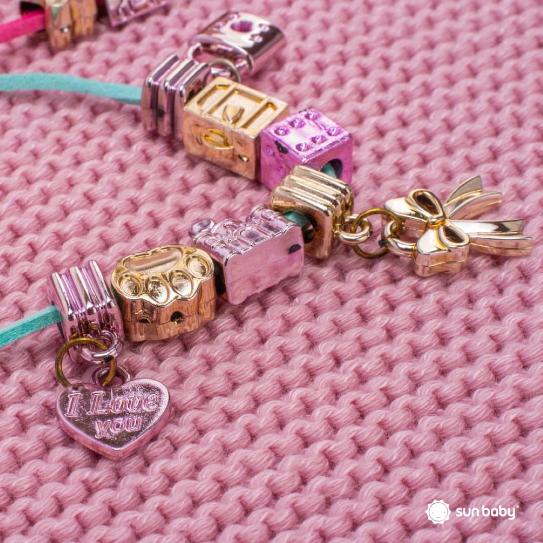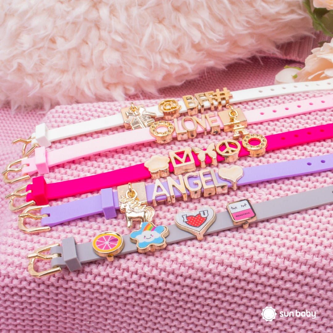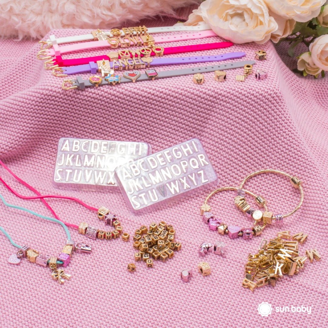 - opaski na nadgarstek – Z zestawu można stworzyć 5 unikalnych opasek na nadgarstek, personalizując je za pomocą nakładek z literkami i tematycznych zawieszek.
