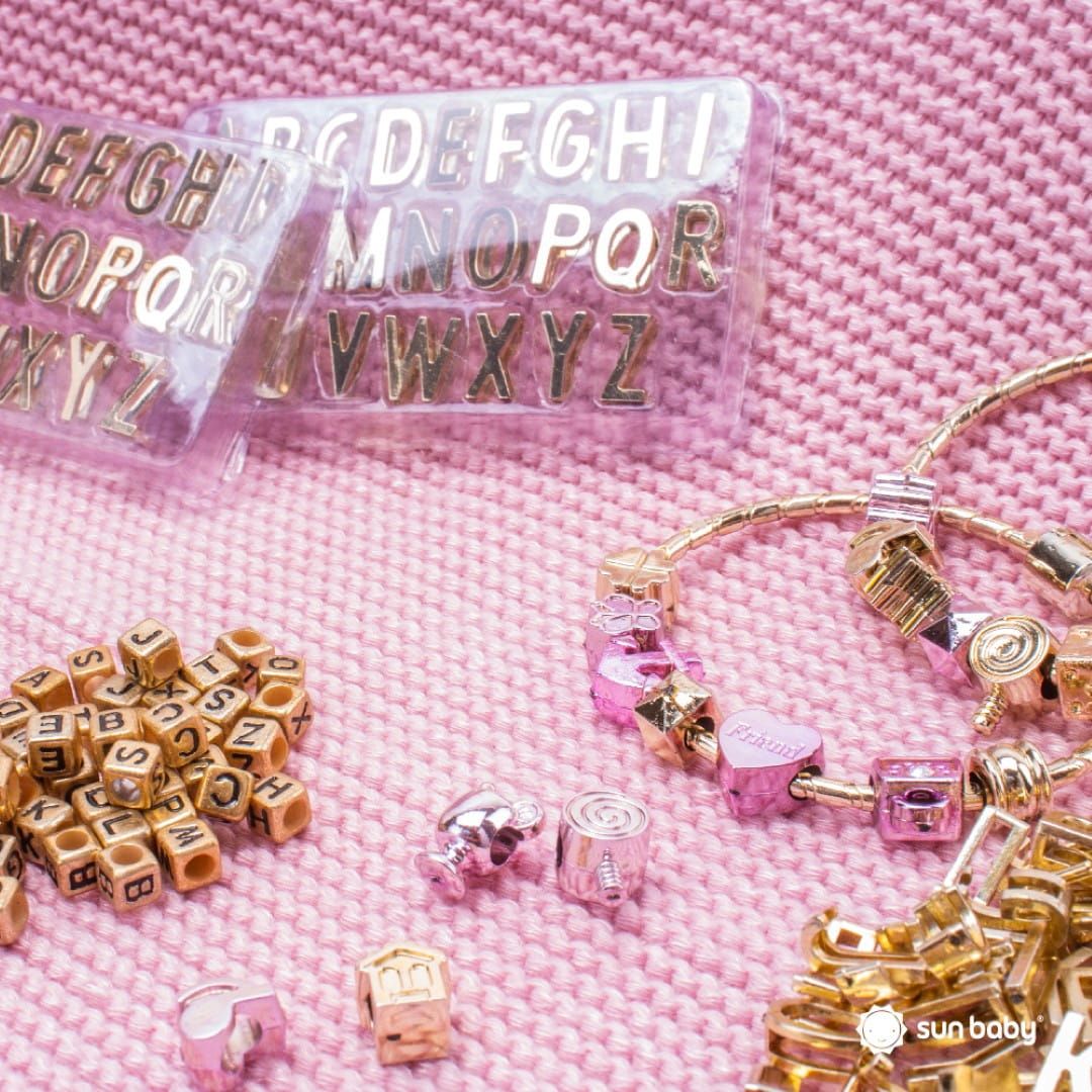 - bransoletki – Zestaw zawiera 2 bransoletki bazowe, które można ozdobić koralikami z literkami i charmsami, tworząc 2 wyjątkowe bransoletki.